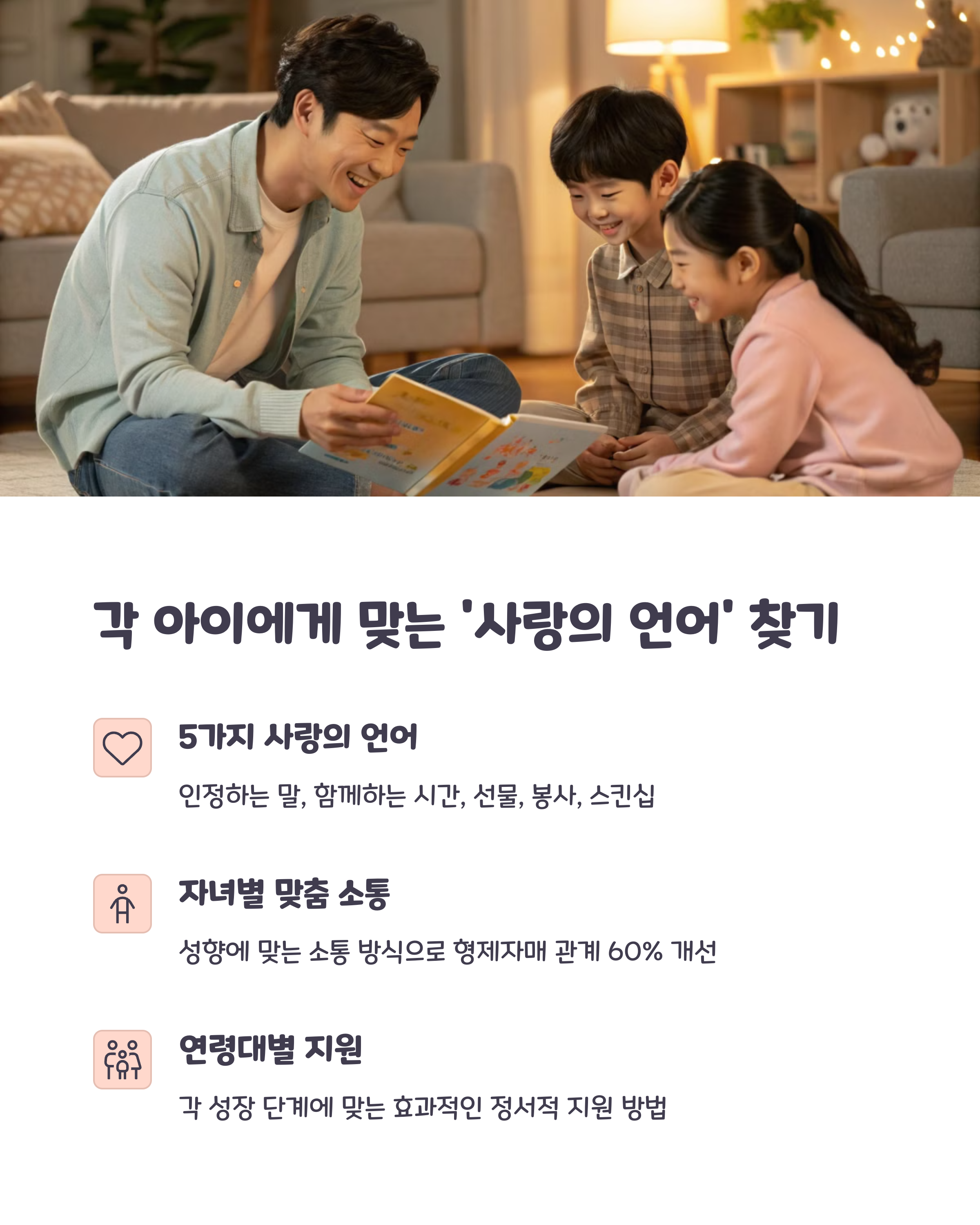 둘째, 아이마다 다른 방식으로 애정을 표현하는 것도 중요합니다. 첫째는 대화형, 둘째는 스킨십형, 셋째는 그림 그리기 등 각 아이의 사랑 언어를 파악해 그에 맞는 시간을 보내세요. 첫째와는 산책하며 대화를, 둘째와는 안아주며 뒹굴기, 셋째에겐 그림 그리며 칭찬하기 등 시간의 길이보다 질이 훨씬 더 중요합니다. ‘함께 있었던 기억’이 아이의 마음을 채웁니다.