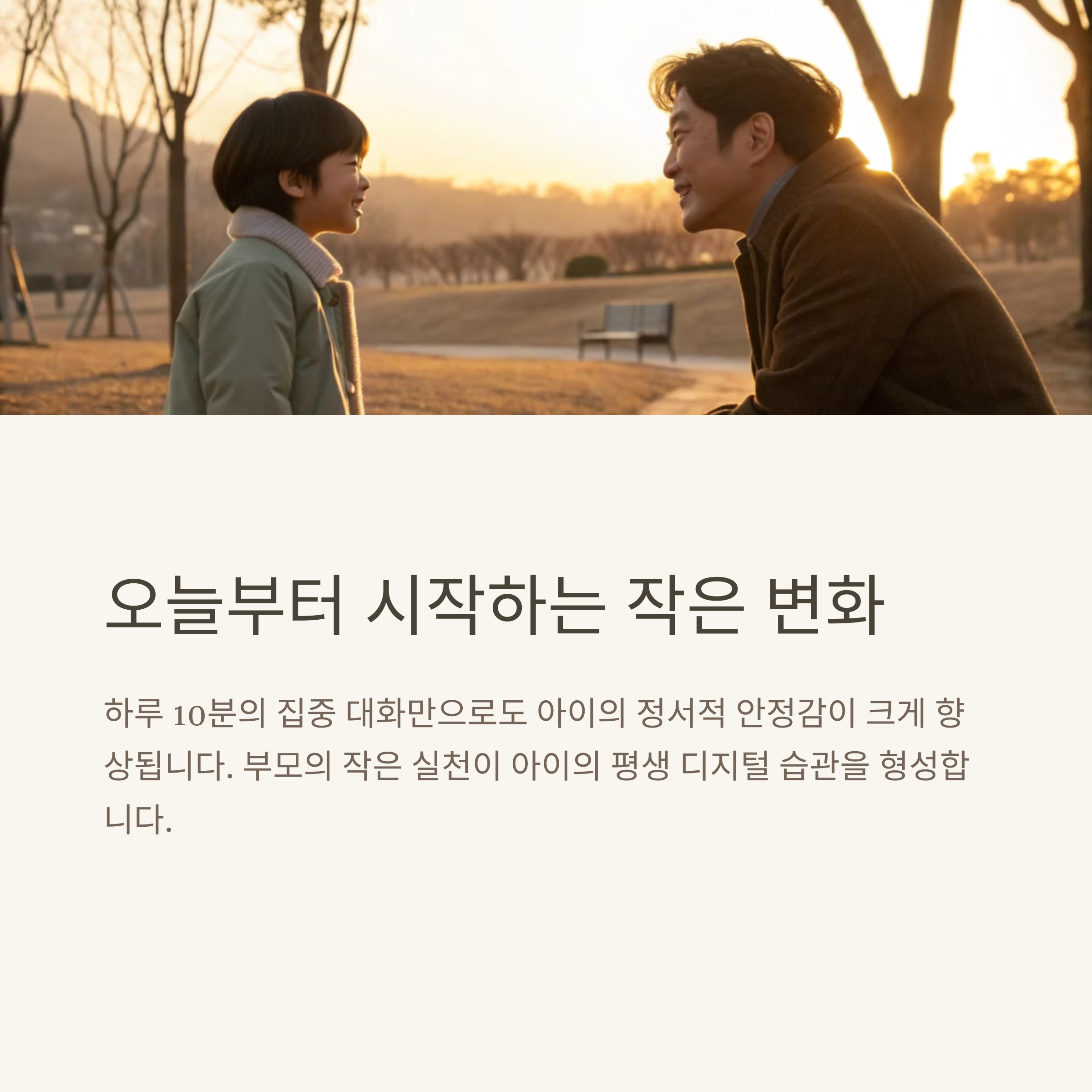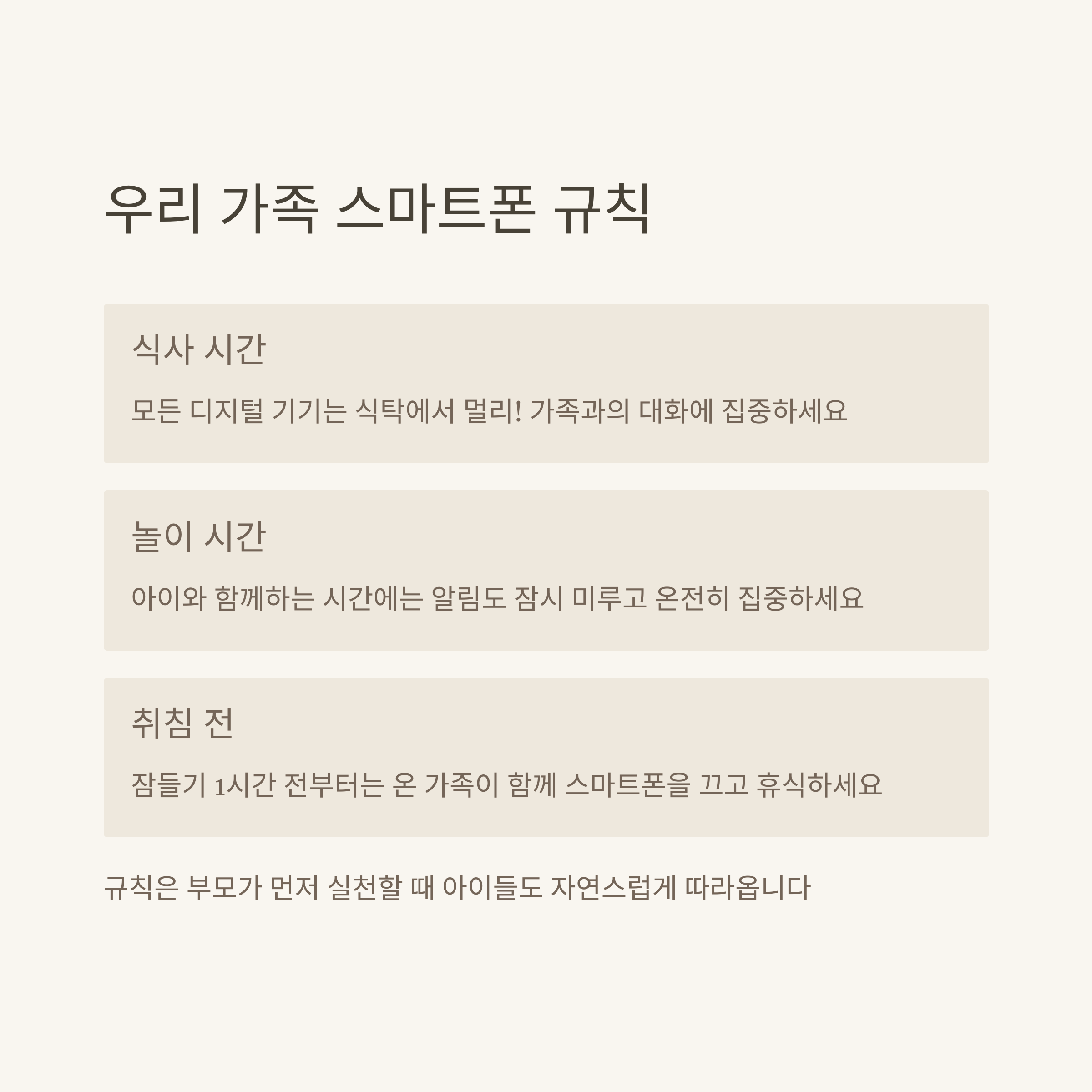 | 대화 중 스마트폰 사용 자제 | 가족 시간에는 디지털 기기 없이 함께하기 | “엄마도 폰 쉬는 시간” 직접 실천 보이기 |
