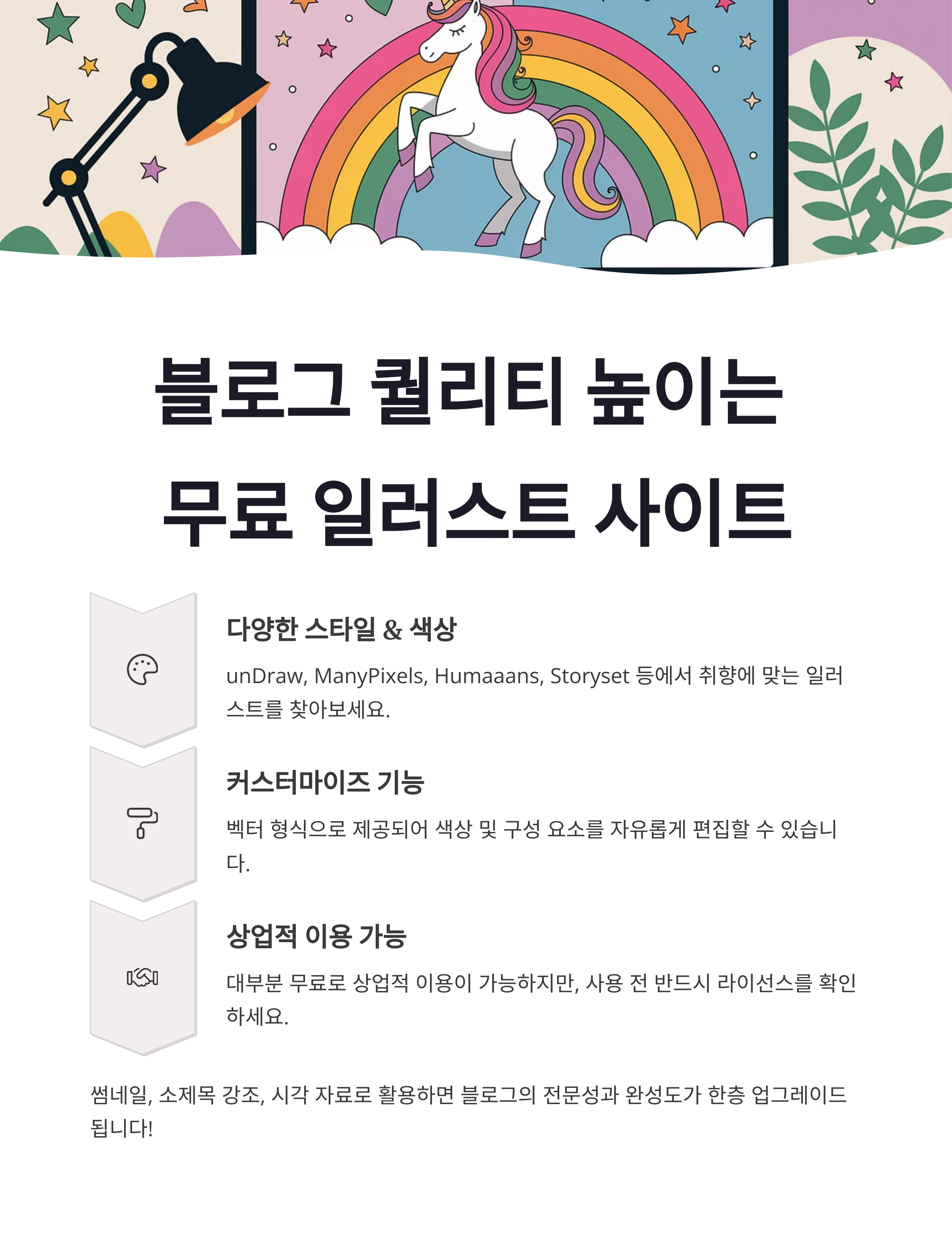블로그는 글만으로 완성되지 않습니다. 이미지, 특히 일러스트는 콘텐츠의 분위기와 메시지를 시각적으로 표현하는 도구입니다.