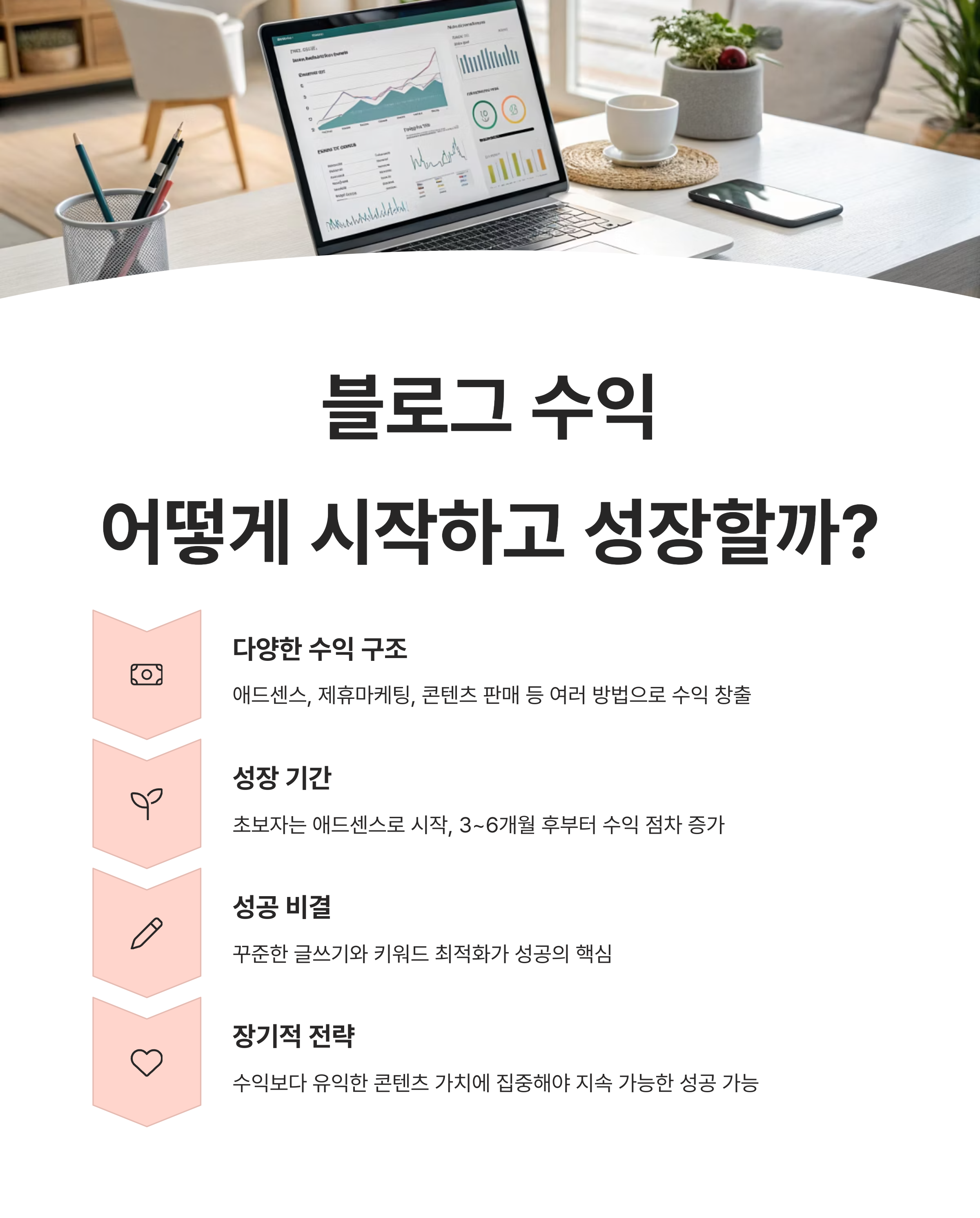 블로그는 단기 수익보다는 장기 콘텐츠 자산 구축에 초점을 맞춰야 합니다. 수익이 주된 목적이 되면 글쓰기가 금방 지치고, 글의 질도 떨어집니다.