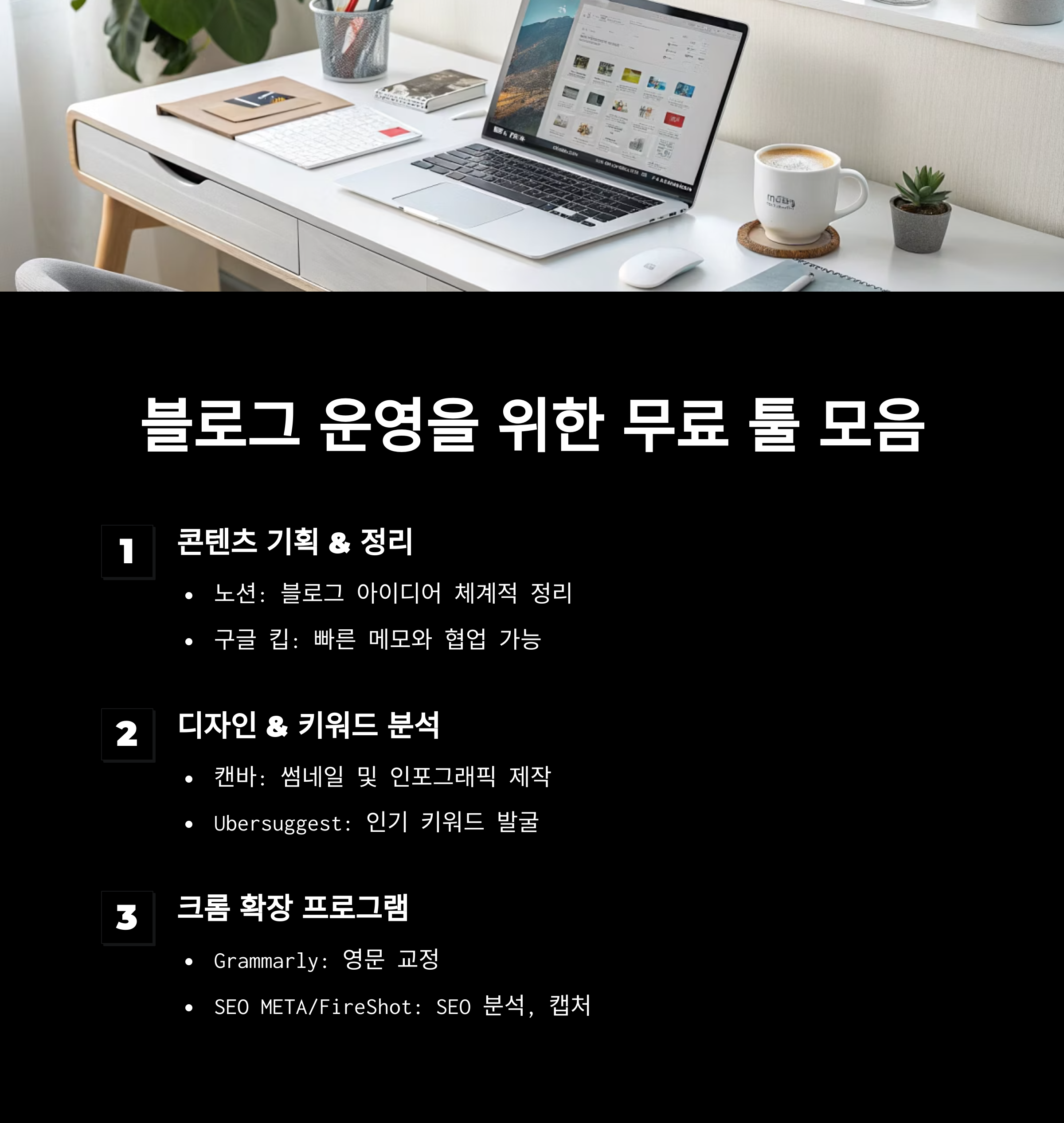 블로그는 단순한 글쓰기에서 시작하지만, 그 외의 **툴과 시스템을 잘 활용하면 콘텐츠의 퀄리티와 효율이 2배 이상** 올라갑니다. 오늘 소개한 무료 도구들을 하나씩 실험해보며, 당신만의 블로그 운영 루틴을 구축해보세요. 😊