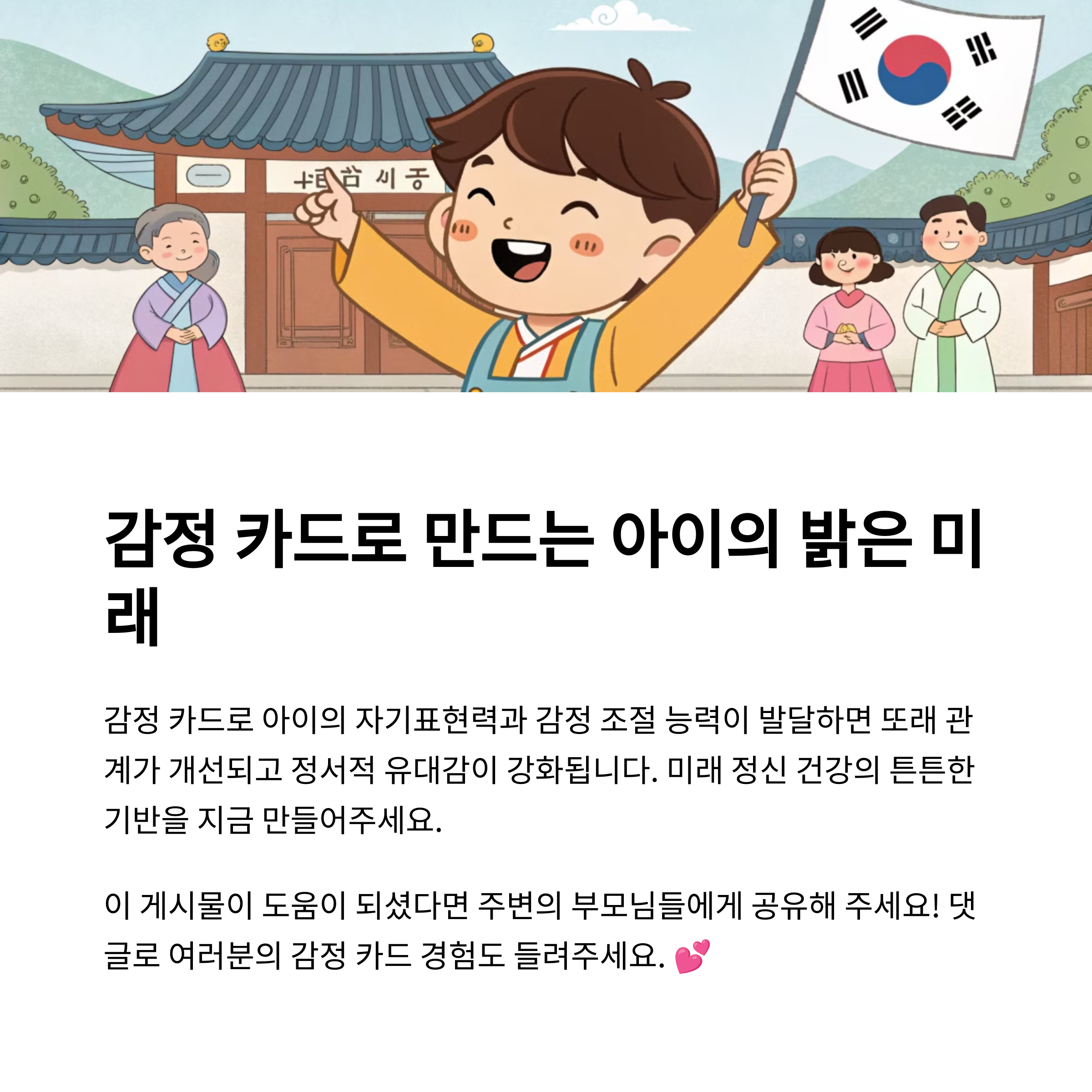 감정 카드, 어떻게 활용해 보셨나요? 혹은 아이의 감정을 이해했던 특별한 순간이 있으신가요? 댓글로 여러분의 이야기를 나눠 주세요. 함께 나누는 경험이 더 큰 공감을 만들어냅니다.