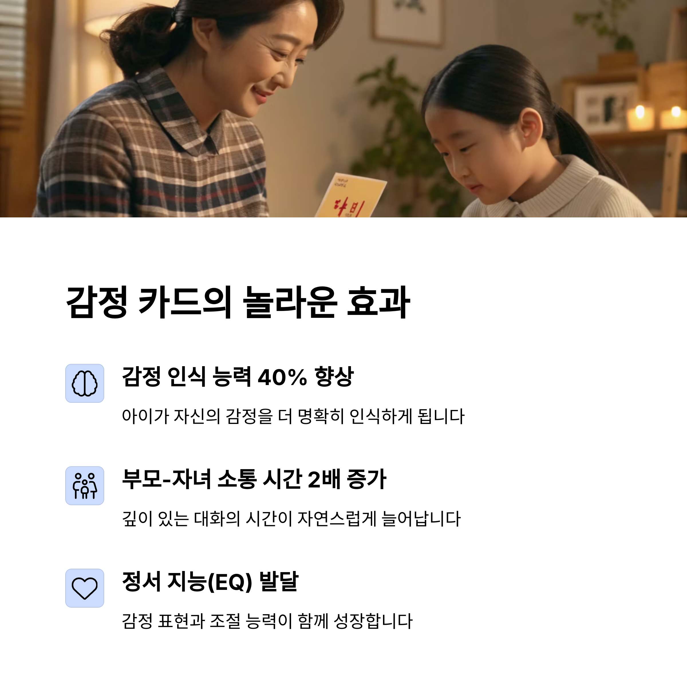 | 감정 카드의 장점 | 공감력, 자기이해, 대화 능력을 키워주는 도구입니다. |