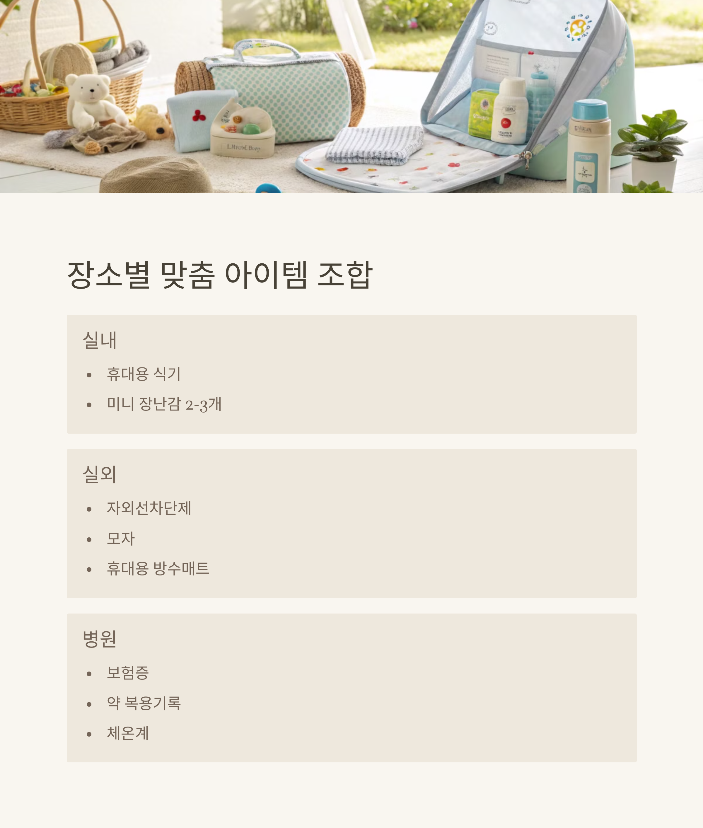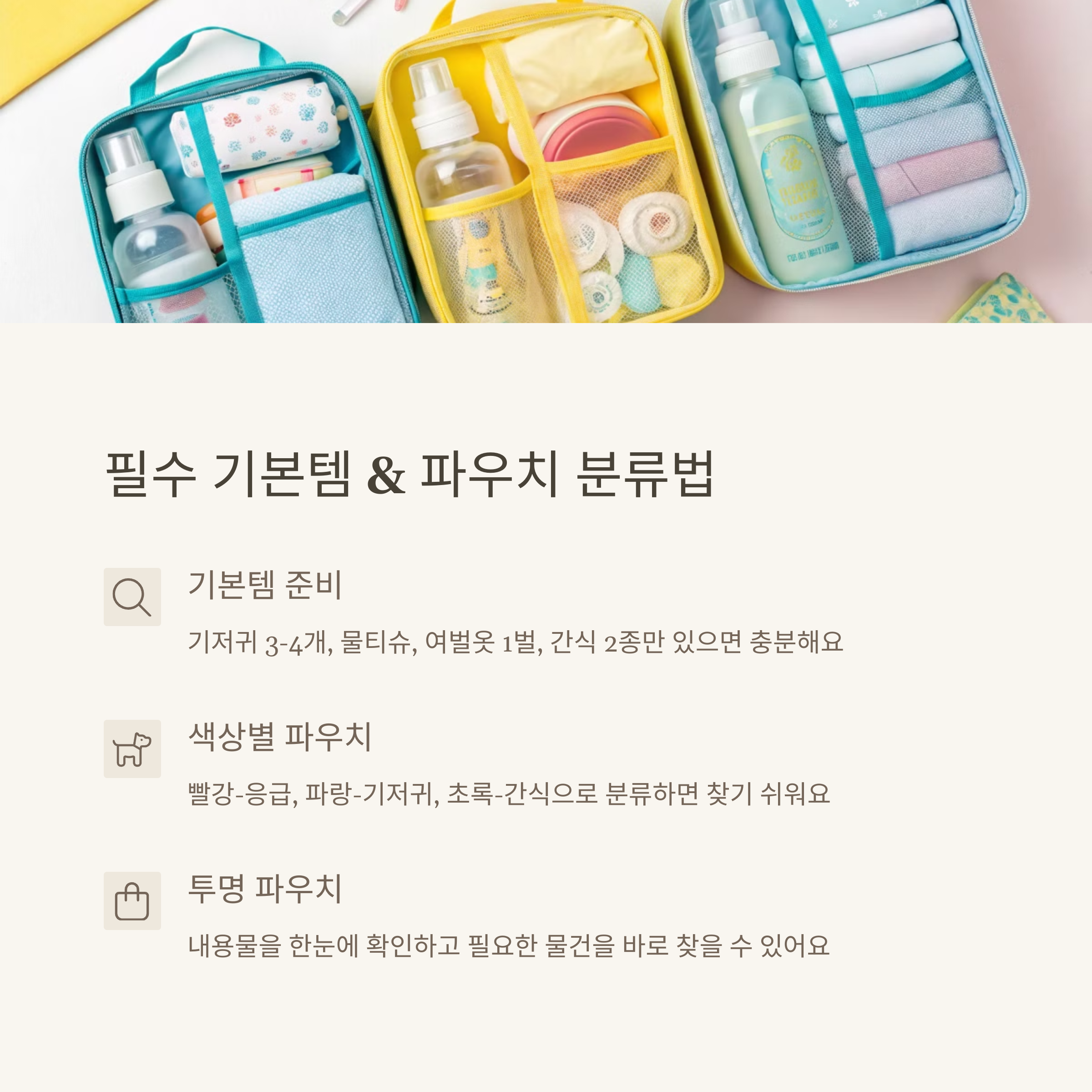기저귀, 물티슈, 간식, 여벌옷, 장난감 실내: 책, 사운드북 / 야외: 썬크림, 모자, 담요 파우치 분류 수납 / 다용도 아이템 중심