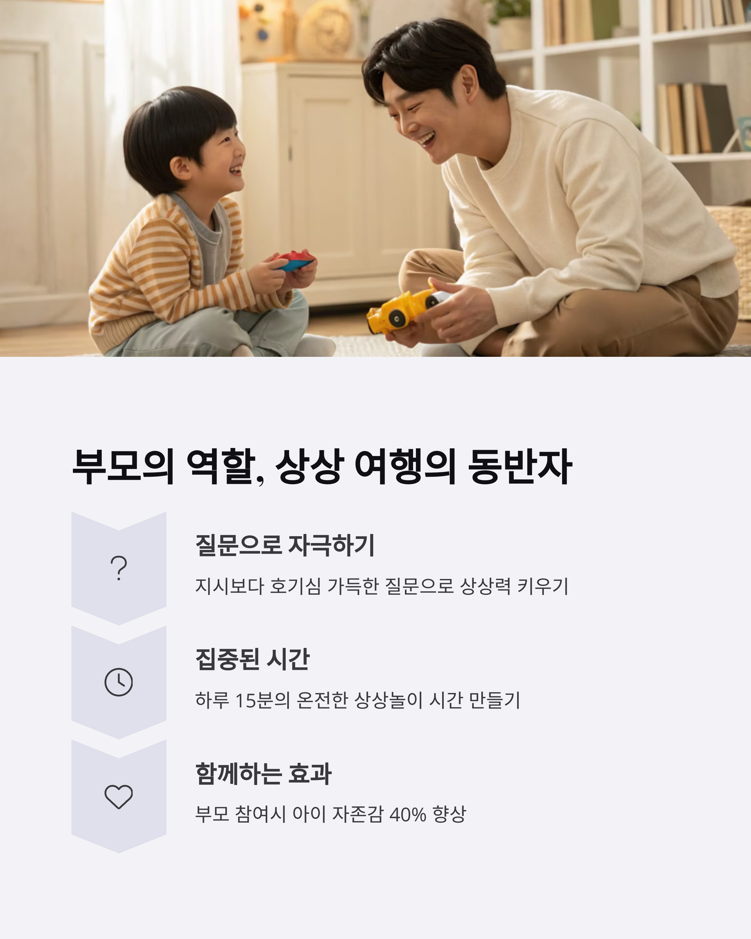 장난감이 없어도, 특별한 도구 없이도 아이의 세계는 무한히 확장될 수 있어요. 부모가 그 상상에 함께 놀아주기만 해도 아이는 더 깊은 몰입과 교감을 느낍니다. 오늘 하루 10분, 아이의 이야기에 몸을 맡겨보세요. 놀이는 도구가 아닌 마음에서 시작됩니다. 그리고 아이의 마음은 이미 준비되어 있어요.