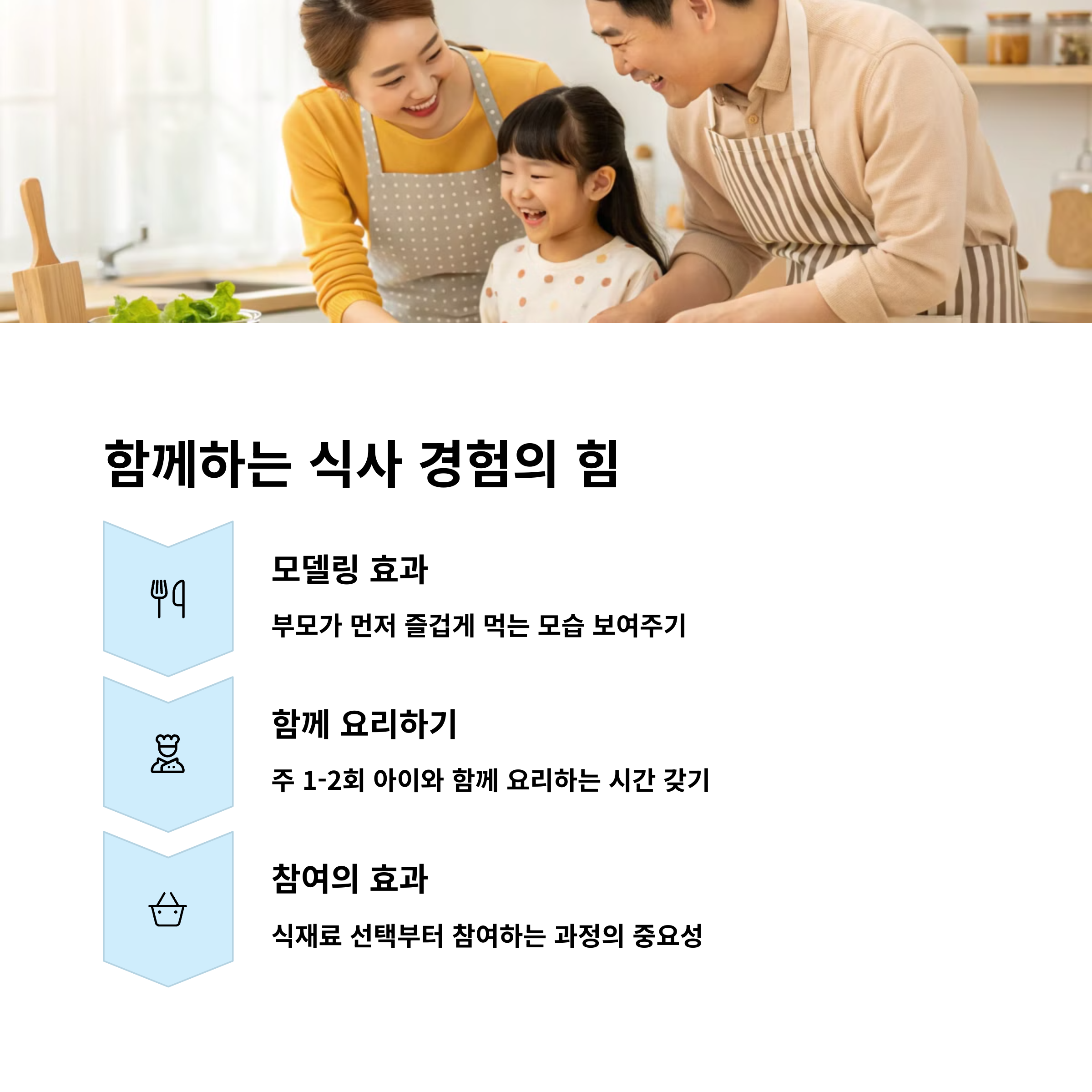 | 감각 예민, 경험 부족, 강제 섭취의 부작용 | 조리법 다양화, 반복 노출, 주 단위 계획 | 요리 참여, 부모의 모델링, 식사 긍정 강화 |