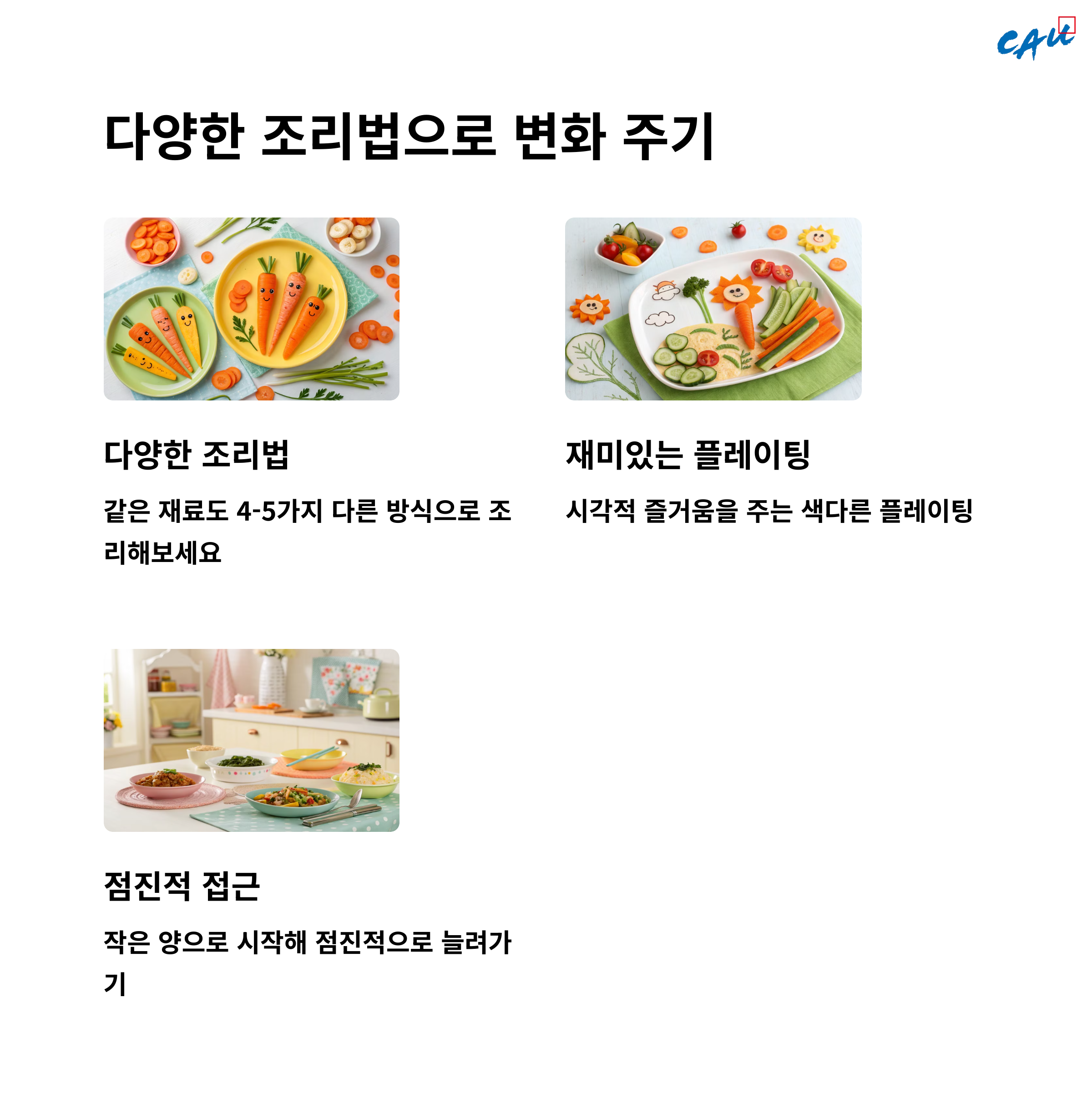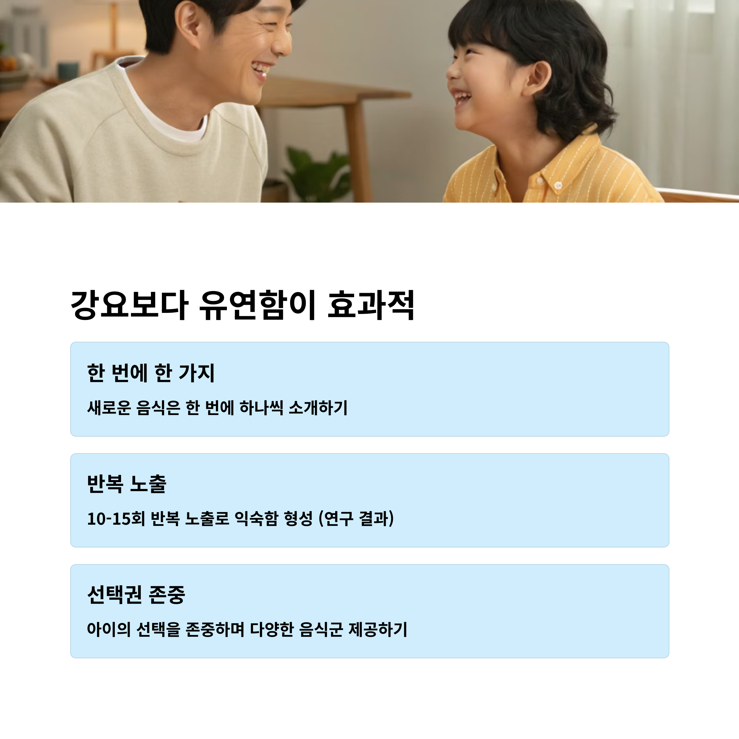 | 해결 방법 | 부드러운 노출, 놀이형 식사, 긍정적 피드백이 효과적 |