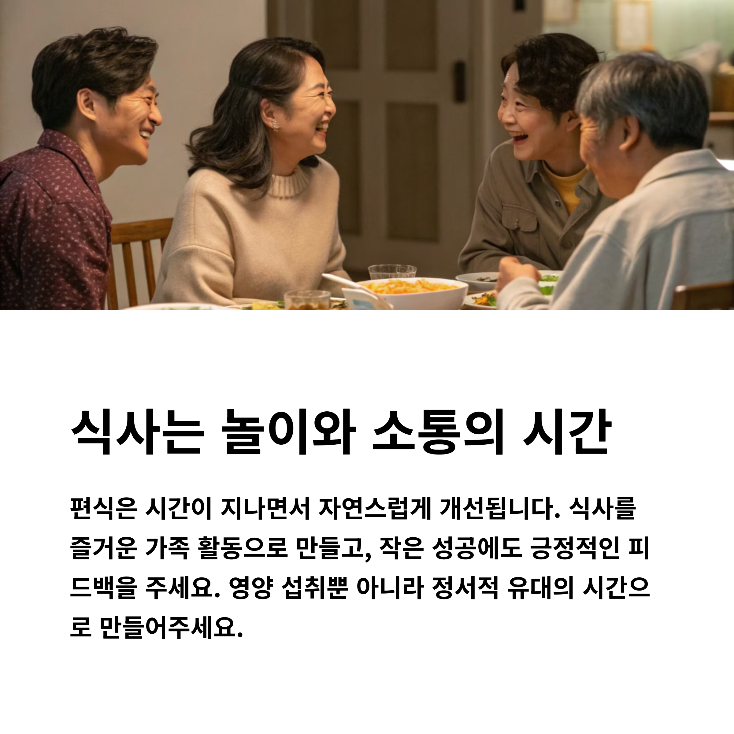 | 억지보단 공감, 흥미 자극이 우선입니다 | 실패하더라도 유연하게 다시 시도하세요 | 함께 먹는 식사 경험이 제일 큰 자극입니다 |