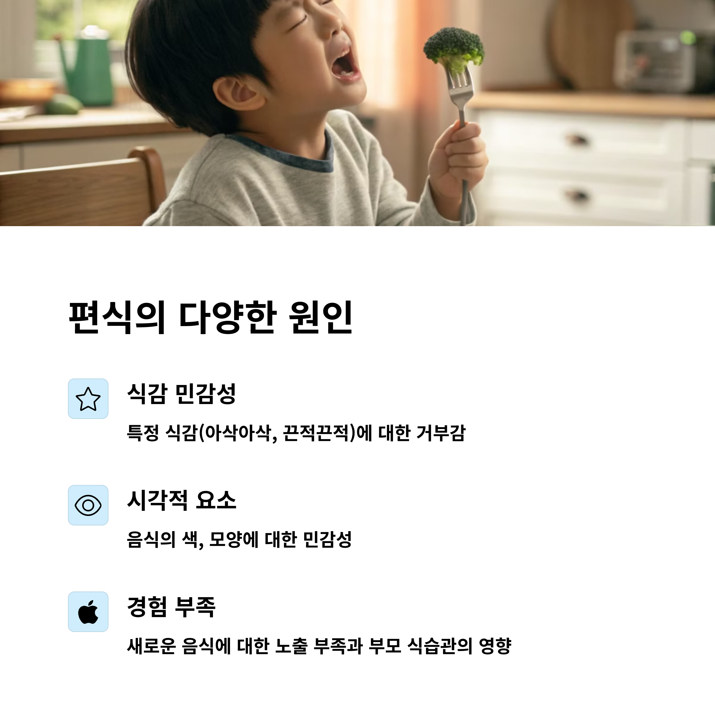 | 편식 원인 | 감각 민감성, 부정적 경험, 맛에 대한 거부 반응 |