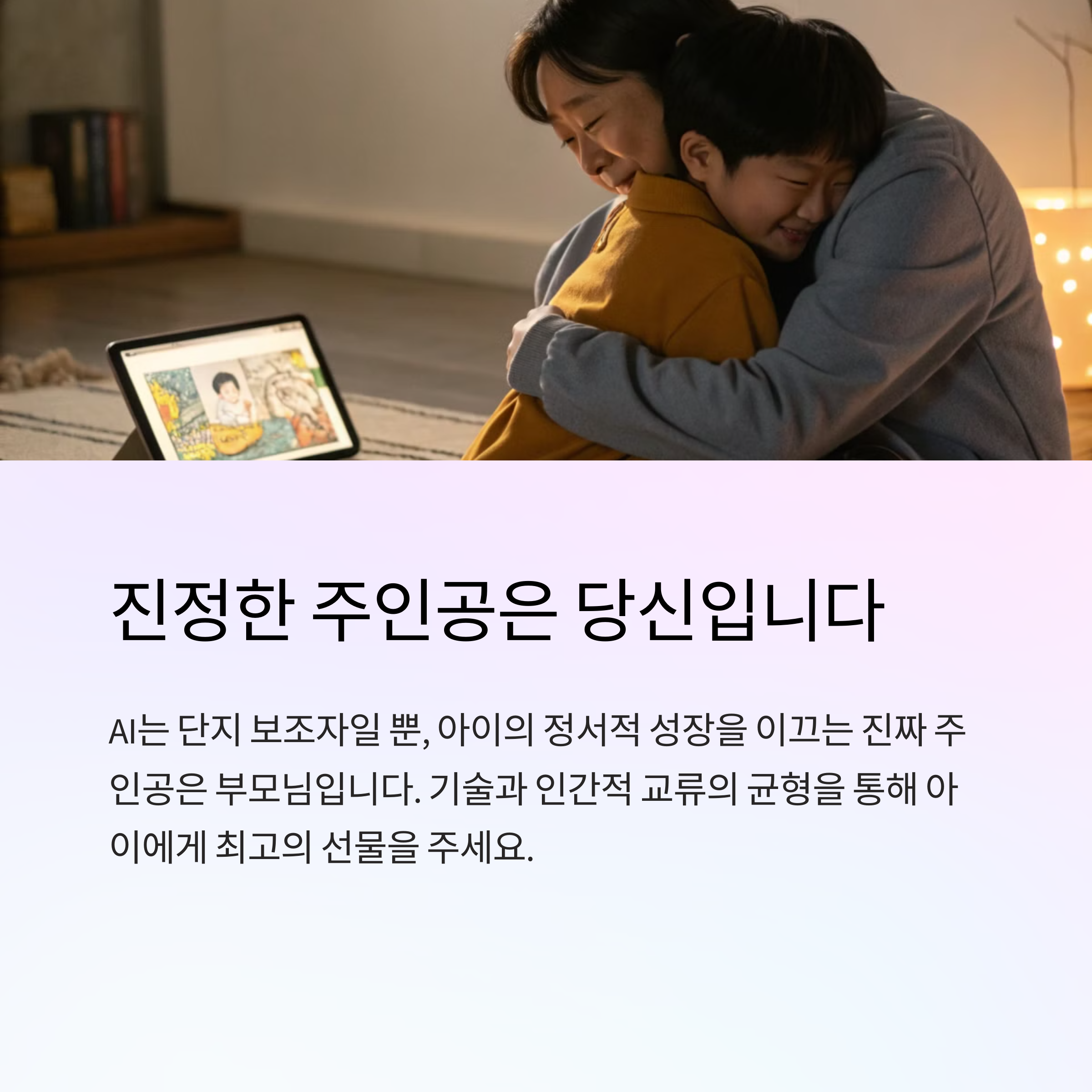 AI 동화앱은 잘만 활용하면 아이의 언어 감각과 흥미를 자극하는 좋은 도구가 될 수 있습니다. 하지만 정서적인 교감은 부모와의 시간에서 비롯된다는 점, 잊지 마세요. 기술은 보조자일 뿐, 아이의 마음을 이해해주는 주인공은 결국 ‘부모’입니다. 오늘, 아이와 AI 동화를 한 편 듣고 따뜻한 감상 한마디 꼭 나눠보세요.